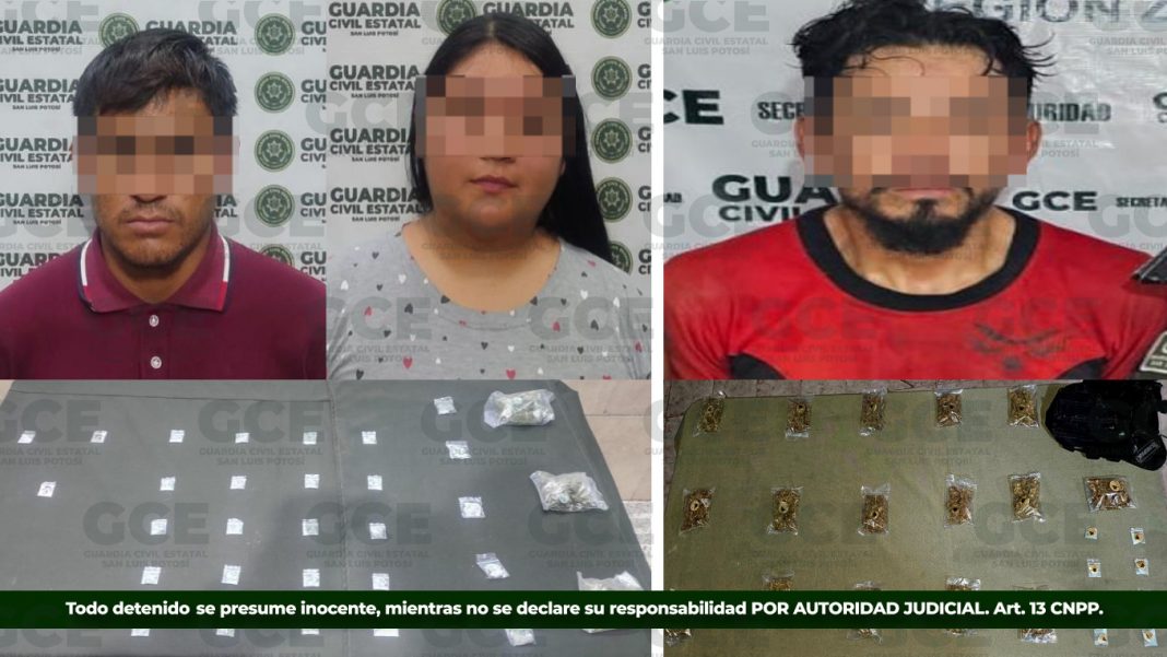 El primer hecho se registró en la colonia Díaz Ordaz en Santa María del Río, donde elementos de la GCE detuvieron a Martín “N” de 26 años y a Marlene “N” de 19 años, tras asegurarles la cantidad de 20 dosis de “cristal”, ocho dosis de cocaína y tres de marihuana. Mientras que en la carretera Cerritos-Mezquites Chicos en el municipio de Cerritos, David “N” de 34 años, fue asegurado con 16 dosis de marihuana y ocho dosis de “cristal”.