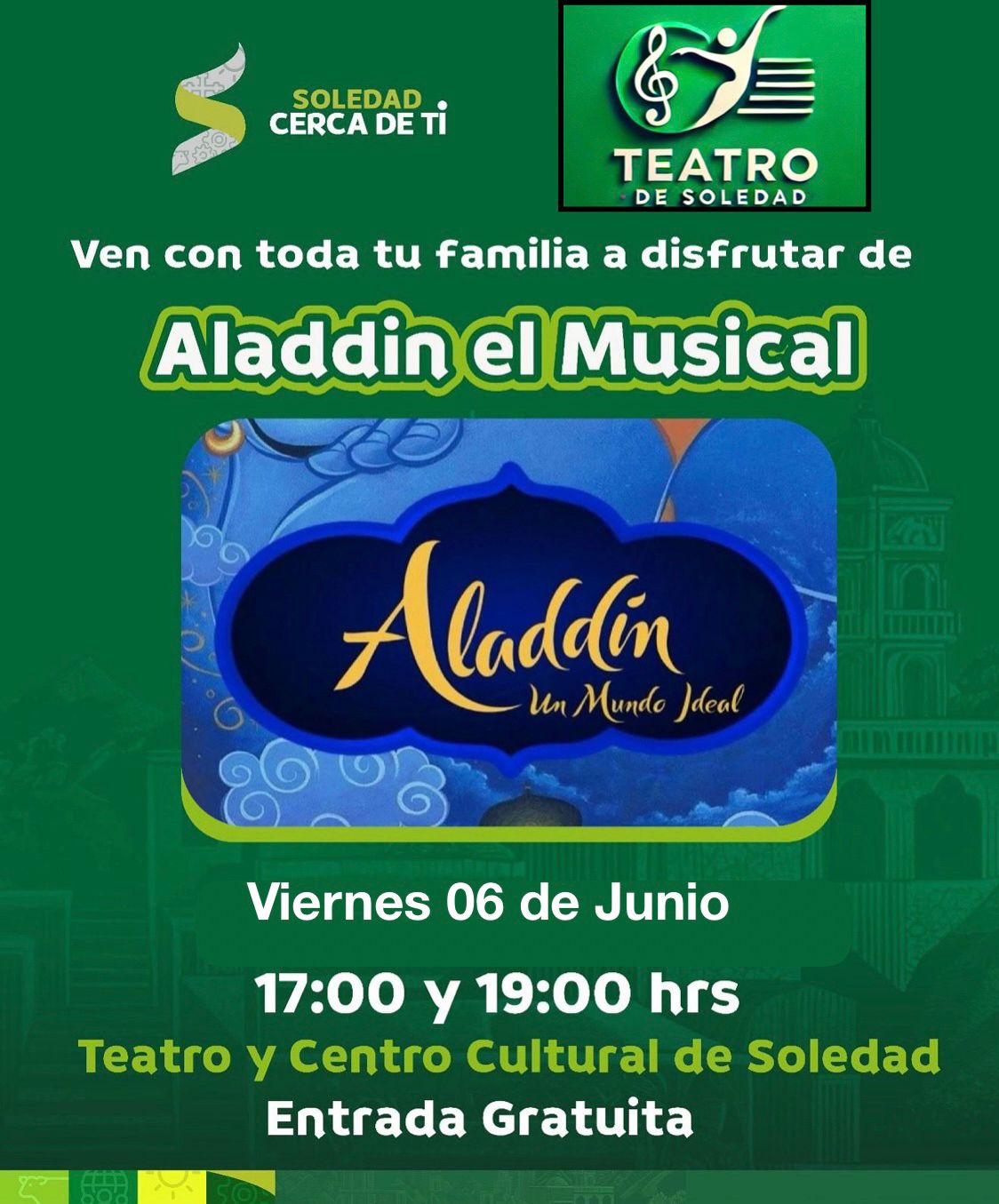 Con dos funciones con entrada gratuita, el espectáculo para toda la familia “Aladdin, El Musical ” se presentará el próximo viernes, 6 de junio, en dos horarios: a las 17:00 y 19:00 horas en el Teatro y Centro Cultural de Soledad, ubicado en calle Santa Martha en la colonia Rancho Blanco.