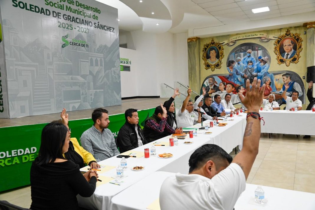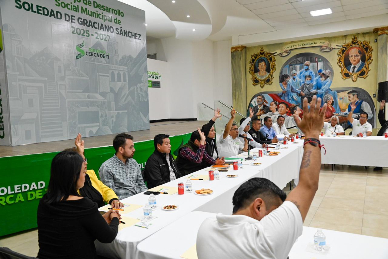 Juan Manuel Navarro Muñiz, Alcalde de Soledad de Graciano Sánchez, encabezó la sesión ordinaria del Consejo de Desarrollo Social Municipal en la que participaron titulares de diversas áreas de la administración y consejeros vecinales de distintas colonias, con el objetivo de dar puntual seguimiento a las solicitudes ciudadanas en materia de seguridad, infraestructura, vialidad, alumbrado, agua potable y servicios municipales.