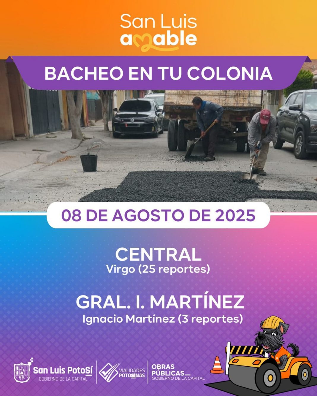 - La Dirección de Obras Públicas de San Luis Potosí respondió este viernes a más de 35 reportes ciudadanos con trabajos de bacheo emergente en calles de cuatro colonias; además, se realizaron labores de desazolve en Esmeralda y Santa Fe, y continúa la construcción de rampas inclusivas en Escalerillas y otras zonas del municipio.