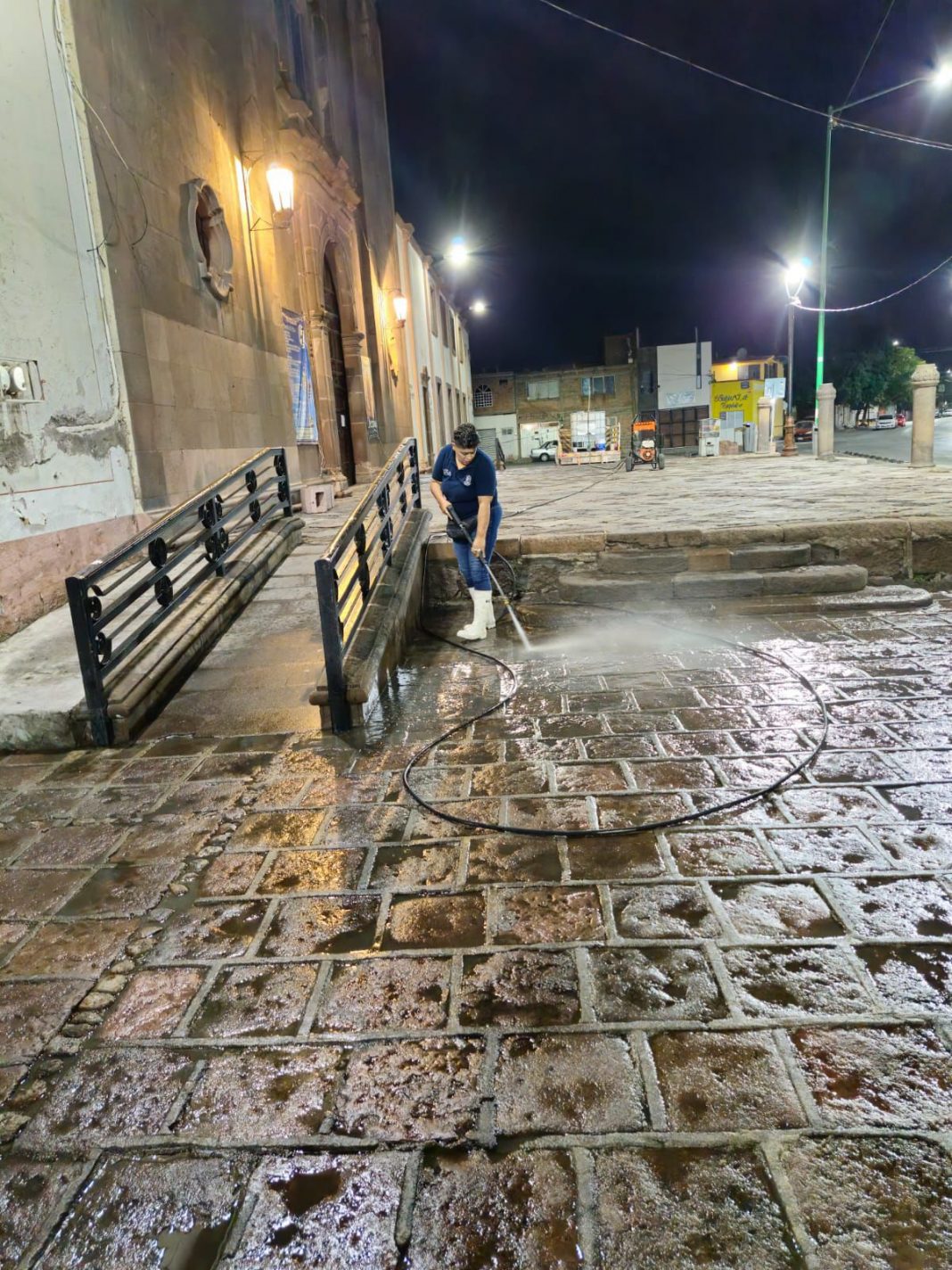 Asimismo, personal de la dependencia hizo limpieza a fondo con equipo de hidrolavado en el exterior del Centro Cultural Palacio Municipal y en el atrio de la Catedral, para retirar suciedad acumulada y chicles, con lo que también mejoró el aspecto de dos de los lugares más representativos del Centro Histórico.
