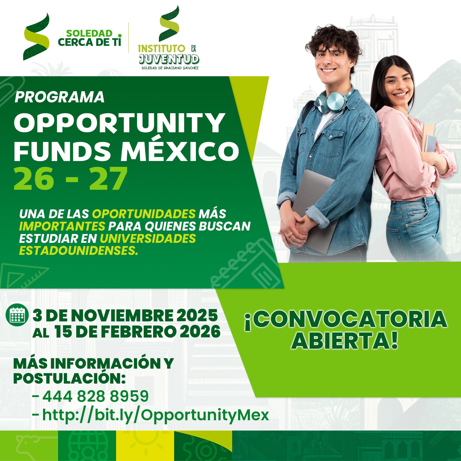 Atendiendo el compromiso del Gobierno Municipal por acercar alternativas de crecimiento académico a la comunidad estudiantil, el Ayuntamiento de Soledad de Graciano Sánchez, a través del Instituto Municipal de la Juventud, invita a las y los jóvenes estudiantes del municipio a participar en la convocatoria Opportunity Funds de EducationUSA México, una de las becas más relevantes para acceder a estudios universitarios en Estados Unidos, siguiendo las directrices del Alcalde Juan Manuel Navarro Muñiz para impulsar proyectos que fortalezcan el futuro de la juventud.