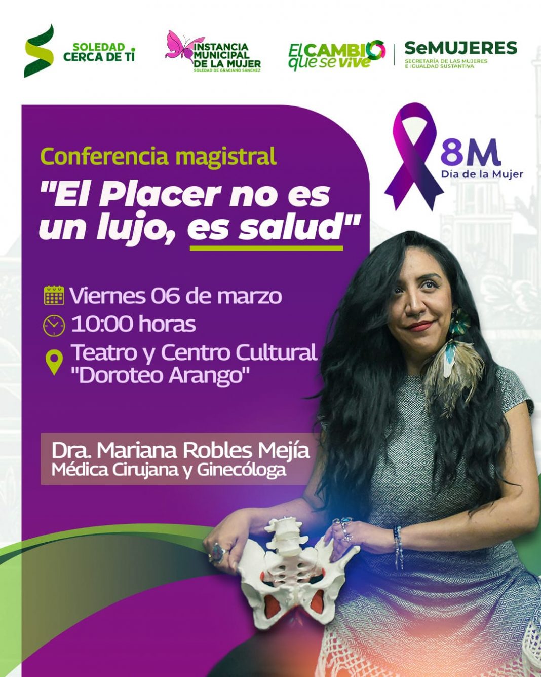 En coordinación con la Secretaría de las Mujeres e Igualdad Sustantiva del Estado de San Luis Potosí, el viernes 6 de marzo a las 10:00 horas, también en el Teatro y Centro Cultural, se desarrollará la conferencia magistral “El Placer no es un Lujo, es Salud”, a cargo de la médica ginecóloga mexicana Mariana Robles Mejía, un espacio orientado a promover la salud integral y el bienestar femenino desde una perspectiva de derechos, reforzando la invitación a toda la población a sumarse a esta conmemoración desde la reflexión y la corresponsabilidad social.