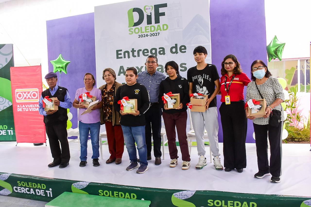 Juan Manuel Navarro Muñiz, Alcalde de Soledad de Graciano Sánchez, encabezó la ceremonia de entrega de 50 aparatos auditivos que fueron donados por la cadena comercial OXXO al Sistema Municipal para el Desarrollo Integral de la Familia (DIF), dispositivos que a partir de hoy transforman vidas de niños, niñas, jóvenes y adultos, mejorando su calidad de vida a través de políticas de inclusión e igualdad social; el evento, realizado en la Unidad Básica de Rehabilitación (UBR) número dos, reunió a familias soledenses que recibieron este apoyo que representa un cambio trascendental en su desarrollo personal y social.
