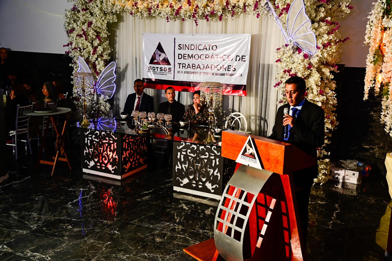 – En representación del Alcalde, Juan Manuel Navarro, el secretario General, Benjamín Pérez felicitó a todos los y las agremiadas del Sindicato Democrático, y reiteró el respaldo a sus derechos y estabilidad laboral en el XXI aniversario de este organización.