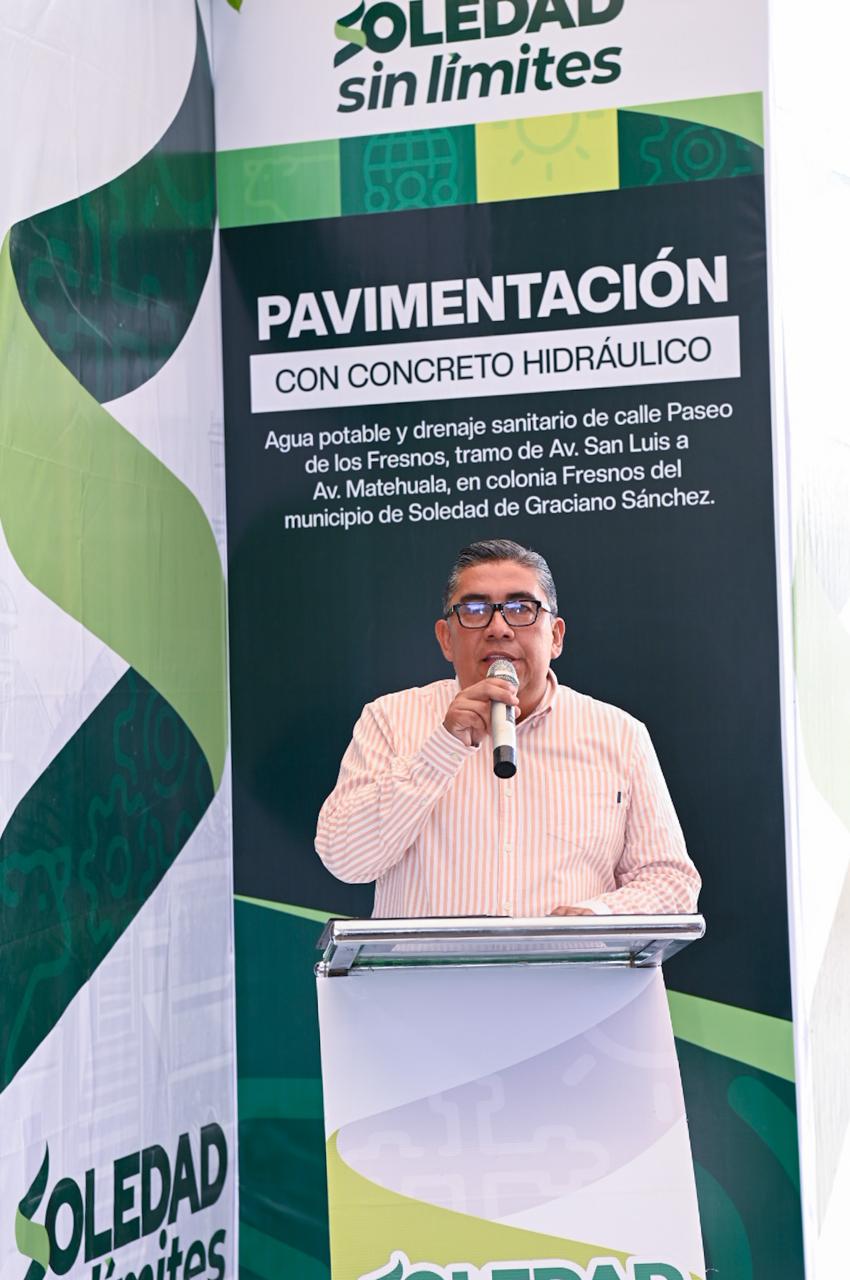 Durante su mensaje, el Alcalde anunció que, con el apoyo del Gobernador del Estado, Ricardo Gallardo Cardona, antes de que concluya su administración todas las calles de la colonia Los Fresnos serán pavimentadas integralmente, con tomas de agua, drenaje y concreto hidráulico. “Este trienio no lo vamos a concluir hasta que estemos realizando todas las calles de Los Fresnos; ninguna se nos va a quedar pendiente, vamos a hacer la obra completa, integral, con agua, drenaje, tomas y descargas, porque en Soledad no hay habitantes de primera ni de segunda”, expresó el edil ante decenas de vecinos reunidos.