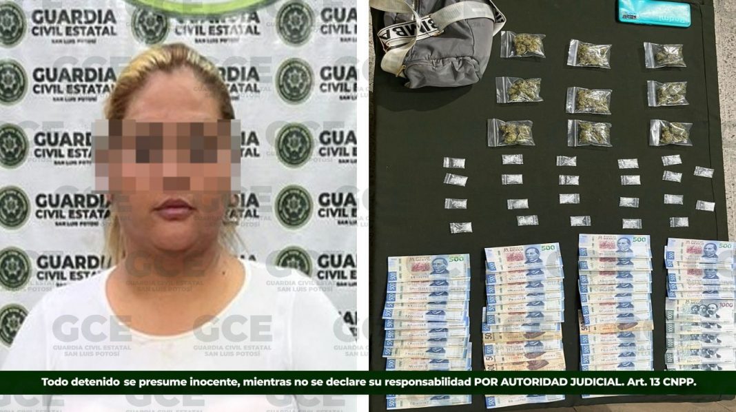 A la presunta, quien cuenta con antecedentes por el delito de fraude, se le aseguraron nueve dosis de marihuana, 22 dosis de “cristal” y 29 mil 500 pesos.