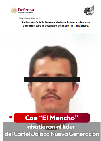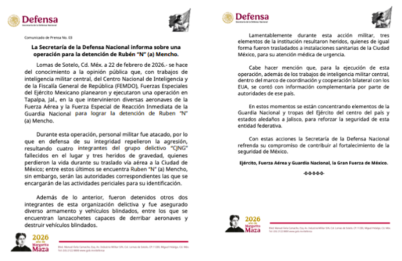 La Secretaría de la Defensa Nacional informa sobre una operación para la detención de Rubén “N” (a) Mencho. Lomas de Sotelo, Cd. Méx. a 22 de febrero de 2026.- se hace del conocimiento a la opinión pública que, con trabajos de inteligencia militar central, del Centro Nacional de Inteligencia y de la Fiscalía General de República (FEMDO), Fuerzas Especiales del Ejército Mexicano planearon y ejecutaron una operación en Tapalpa, Jal., en la que intervinieron diversas aeronaves de la Fuerza Aérea y la Fuerza Especial de Reacción Inmediata de la Guardia Nacional para lograr la detención de Ruben “N” (a) Mencho.