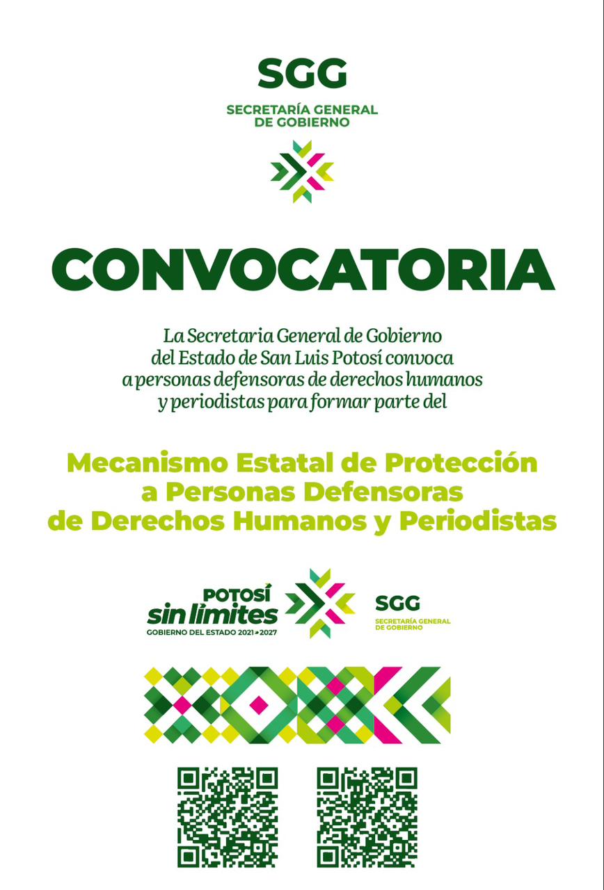 * La Secretaría General de Gobierno publicó convocatorias para elegir cuatro cargos honoríficos que fortalecerán el apoyo y la protección a periodistas y personas defensoras de derechos humanos en san luis potosí.