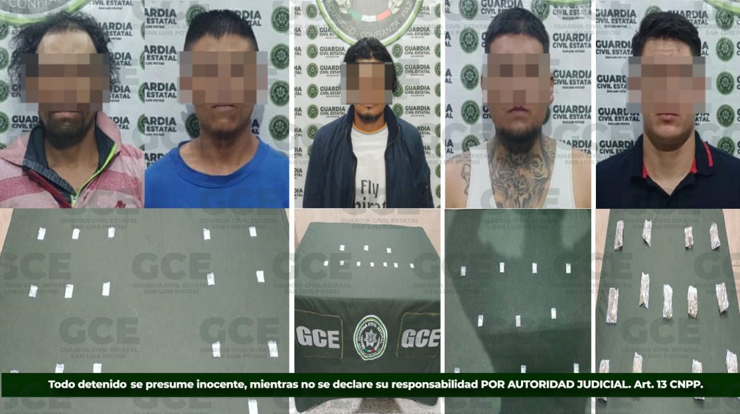 En las últimas 24 horas se detuvo a cinco personas, por presuntos delitos contra la salud: el primer se ubicó en la capital potosina, durante los trabajos de seguridad, en el Barrio de Tlaxcala, se trata de Ignacio “N” de 27 años, quien se ubicó en la zona con 13 bolsas con marihuana; cuenta con un proceso y sentencia del mes de julio del presente año, por portación de un arma de fuego de uso exclusivo de Ejército, Armada y Fuerza Aérea (EAFAM).