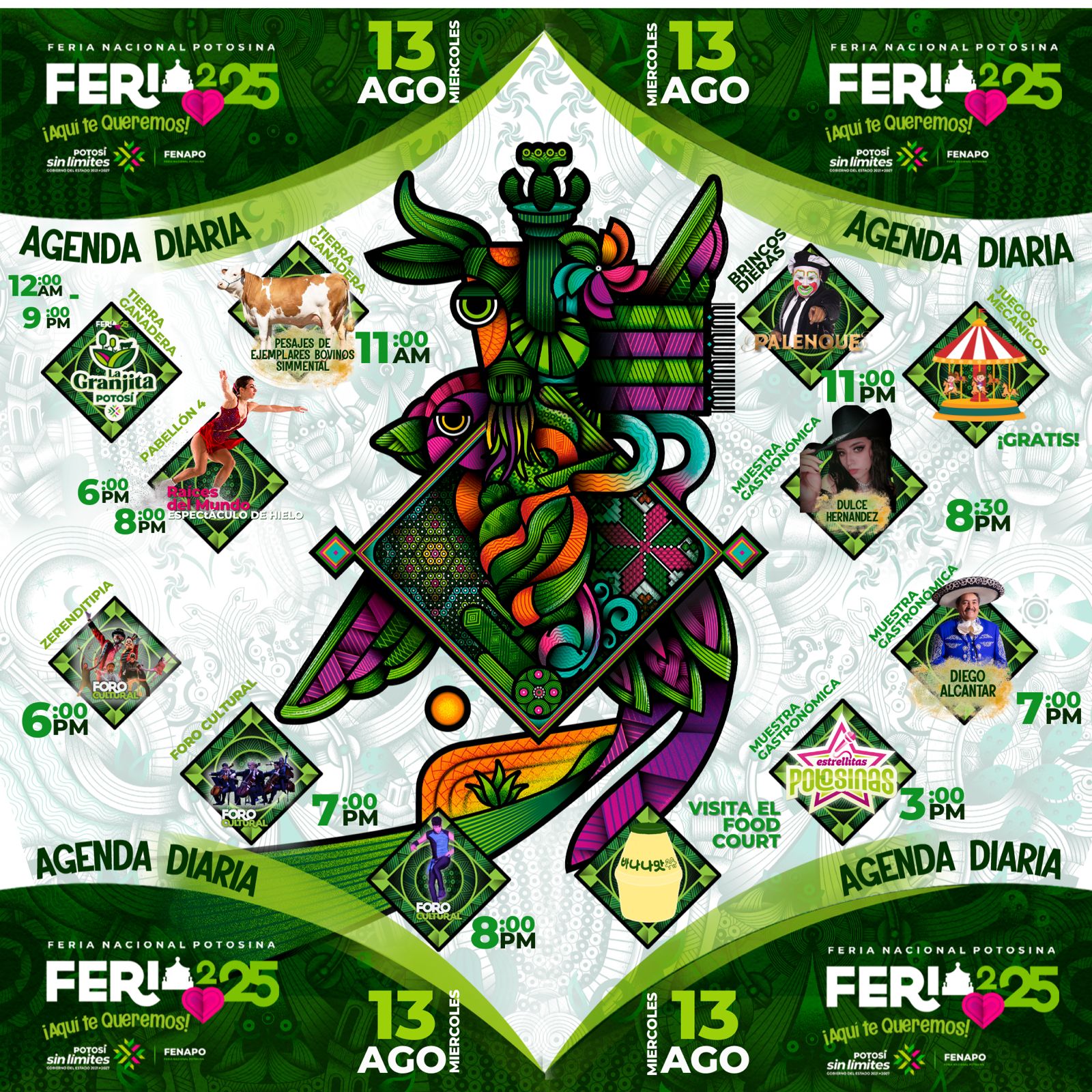 Este miércoles 13 de agosto, en su sexto día de actividades, la Feria Nacional Potosina 2025 continúa ofreciendo una agenda sin límites para el disfrute sin límites de miles de visitantes locales y de otras entidades, que cada vez en mayor número llegan al recinto ferial para vivir esta gran fiesta.