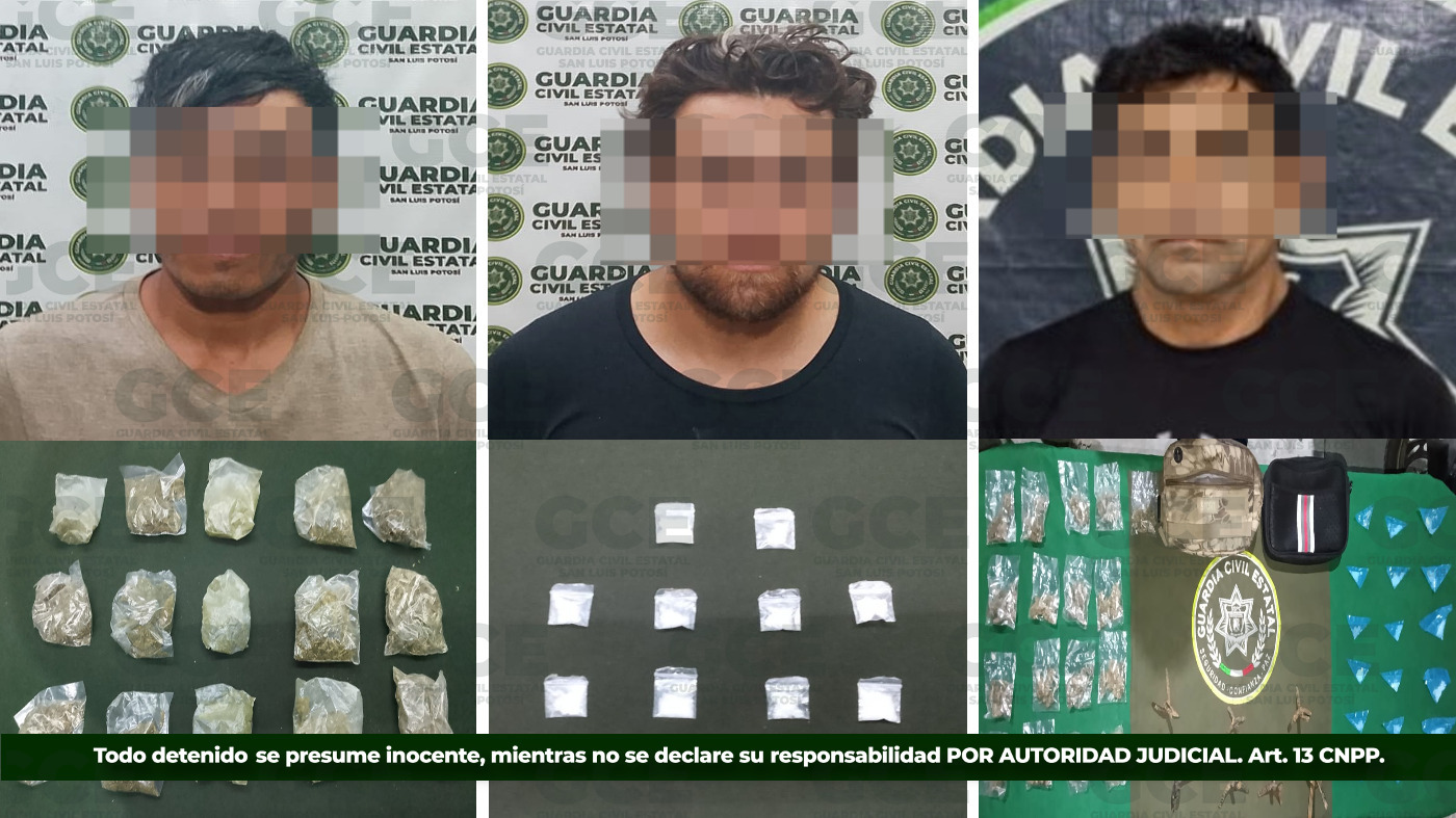 Uno de los hechos ocurrió en la capital potosina, se trata de Ricardo “N” de 30 años de edad, quien fue asegurado con 10 dosis de “cristal”; en el municipio de Salinas de Hidalgo, efectivos de la GCE detuvieron a Demesio “N” de 33 años, tras asegurarle 15 bolsas con marihuana; operativos realizados en el municipio de Ciudad Valles, derivaron en la detención de Ernesto “N” de 41 años, luego de asegurarle 17 dosis de “cristal”, 17 bolsas con marihuana y siete artefactos de varilla conocidos como “poncha llantas”, además de una motocicleta en la que se desplazaba.