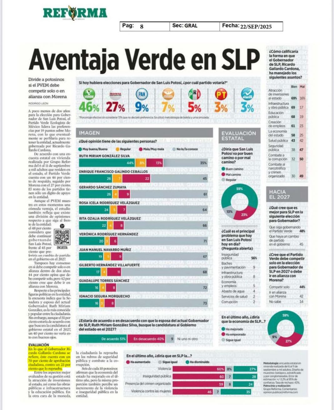 🟢El Partido Verde Ecologista de México (PVEM) en San Luis Potosí se consolida como la fuerza política más fuerte y con mayor respaldo ciudadano rumbo al 2027, de acuerdo con la encuesta publicada este día en el periódico Reforma, uno de los medios nacionales de mayor prestigio.