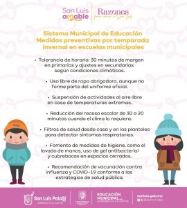 Por instrucciones del Alcalde Enrique Galindo Ceballos, el Gobierno de la Capital, a través de la Dirección de Educación Municipal, implementó desde inicios de noviembre una serie de medidas preventivas en todas las escuelas del Sistema Municipal de Educación, con el propósito de proteger la salud de la comunidad escolar durante la temporada invernal.