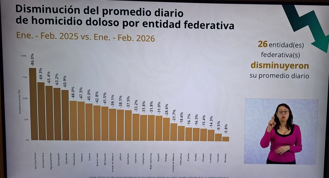 Como resultado de la estrategia integral de seguridad implementada por el Gobernador Ricardo Gallardo Cardona, durante el primer bimestre del año, San Luis Potosí disminuyó 86 por ciento el promedio diario de homicidios dolosos, comparado con el mismo periodo del 2025, ocupando con ello el primer lugar entre las 32 entidades federativas del país.