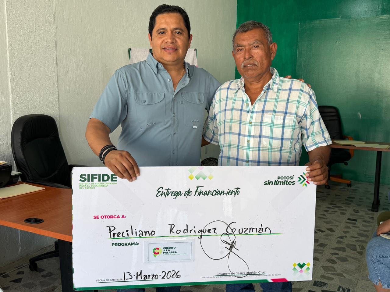Cumpliendo con el compromiso del Gobernador Ricardo Gallardo Cardona de respaldar a quienes buscan salir adelante con su propio negocio, el Sistema de Financiamiento para el Desarrollo del Estado (Sifide) fortalece el programa Crédito a la Palabra, mediante el cual se brinda financiamiento accesible para impulsar proyectos productivos y fomentar el crecimiento económico en las cuatro regiones, con un apoyo sin límites para emprendedores y pequeños empresarios.