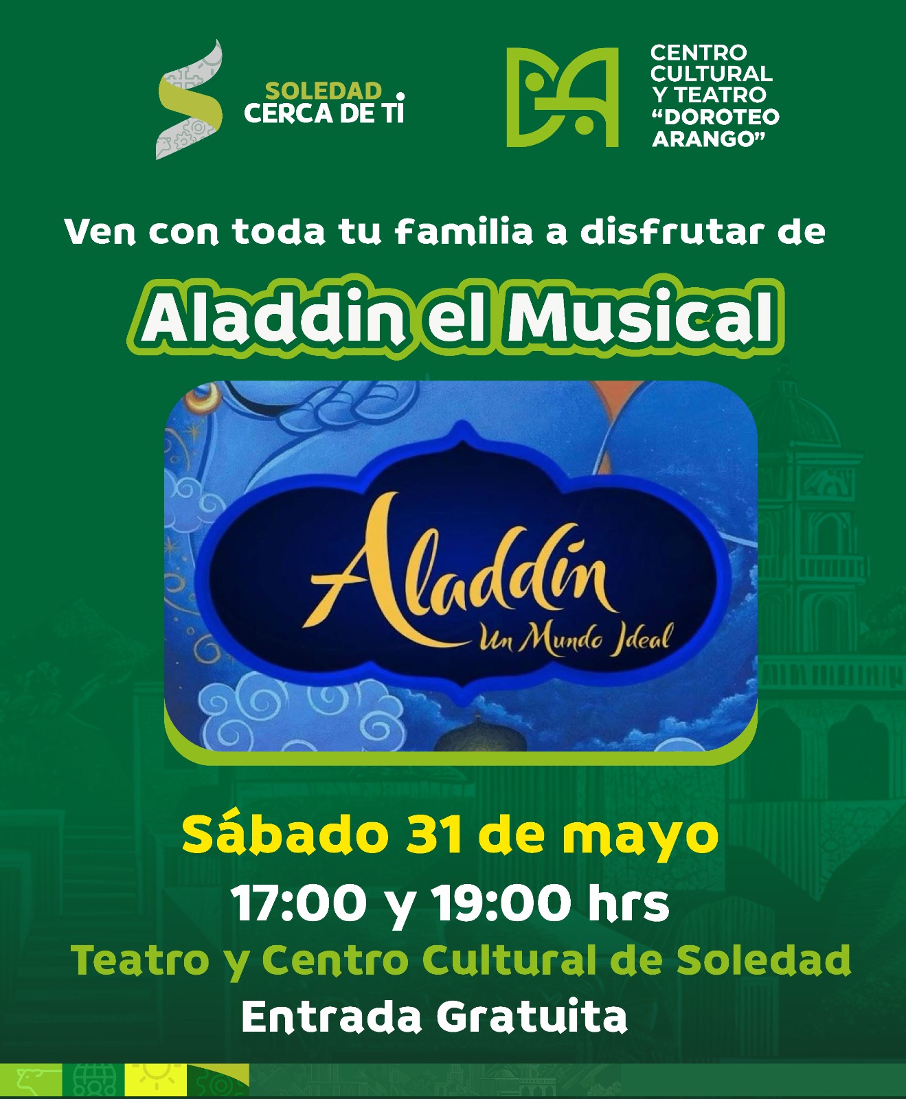 Este sábado 31 de mayo se presentará “Aladdín, el Musical”, una colorida puesta en escena que promete divertir a niñas, niños y adultos por igual, con funciones programadas a las 17:00 y 19:00 horas; el espectáculo se ofrece sin costo alguno para la población, como parte del compromiso del Gobierno Municipal de acercar el entretenimiento de calidad a todos los sectores.