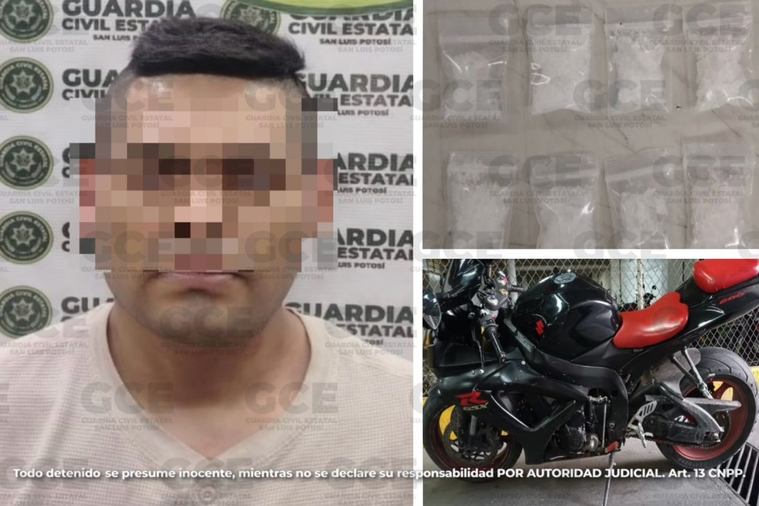 Un operativo de la Guardia Civil Estatal en la colonia Prados segunda sección, en el municipio de Villa de Pozos, derivó en la detención de Alberto “N” de 35 años, por llevar consigo ocho dosis de “cristal”, además de una motocicleta deportiva Suzuki en negro y rojo.