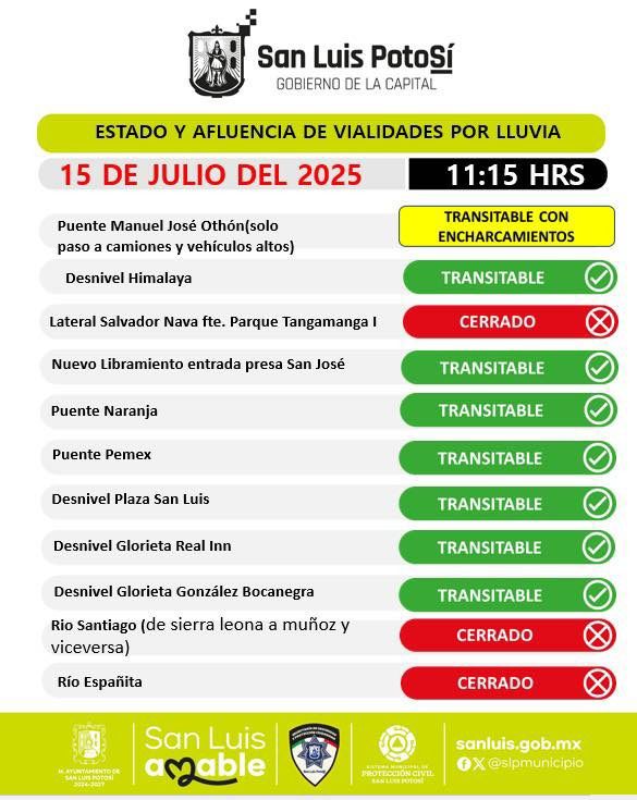 Por su parte, el Director de Policía Vial, José Adolfo Ortiz Ibáñez, reportó afectaciones en vialidades como el Puente Pemex, Real Inn y Manuel José Othón; sin embargo, gracias a labores preventivas en el drenaje, fueron rehabilitadas en cuestión de horas. El Río Españita se mantiene cerrado hasta el momento, mientras que en el Río Santiago el cierre es de Sierra Leona a Muñoz en ambos sentidos..