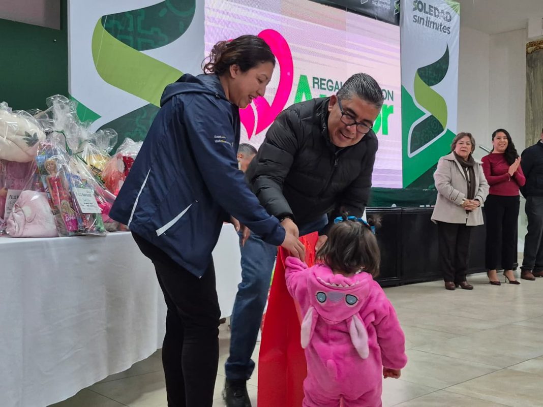 Juan Manuel Navarro Muñiz, Alcalde de Soledad de Graciano Sánchez, encabezó este lunes la entrega de paquetes de regalos del programa “Regalando con Amor”, una acción solidaria impulsada por el Ayuntamiento a través de la Dirección de Turismo y Cultura Municipal, que permitió cumplir los deseos navideños de más de 200 niñas y niños que asisten a las Unidades Básicas de Rehabilitación uno y dos, logrando que cada menor recibiera hasta cinco juguetes, resultado de varios días de recolección y del trabajo cercano con las familias.