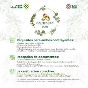 En cumplimiento a las indicaciones del Gobernador del Estado Ricardo Gallardo Cardona, la iniciativa facilita a las parejas la formalización de su relación mediante la celebración de matrimonios colectivos en todos los municipios, promoviendo la armonía social y la estabilidad, con acciones sin límites que beneficien a las familias potosinas.