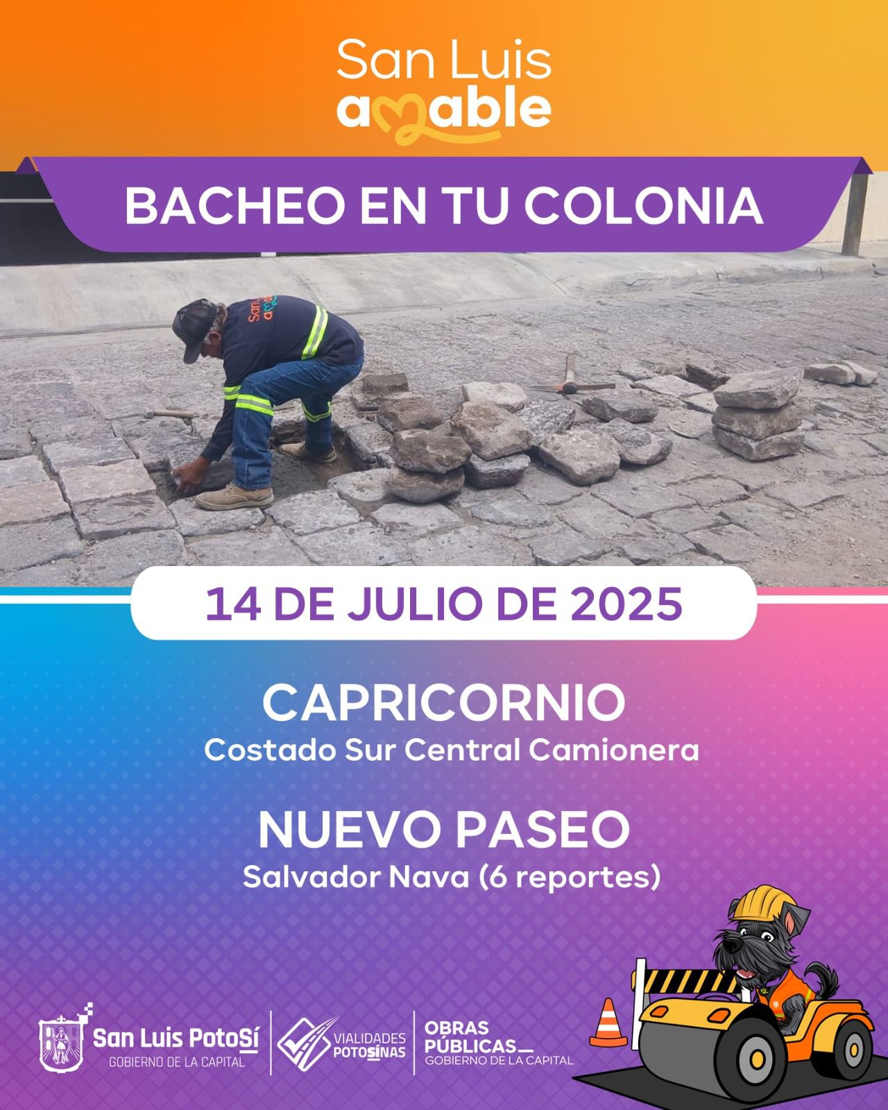 Este lunes 14 de julio se continúa con la atención a reportes que envía la ciudadanía, con 40 atenciones en las calles de: Rubén Darío en la colonia Valle Verde; Luis de Molina del fraccionamiento Tangamanga; Costa Rica, colonia Santuario; Antonio Villaseñor, en el tramo de Niño Artillero a Fray Antonio Vázquez Espinoza, colonia Universitaria; Estrella, de Granizo a Centella, en la colonia Garita de Jalisco; calle Costado Sur Central Camionera, entre Virgo y Géminis, colonia Capricornio; Salvador Nava, en el tramo de Vicente Rivera a Puente Pemex, Nuevo Paseo; Tenco, en el tramo de Puente de Ixtla a Gualiname, en la colonia Tercera Chica 2; Francia, de Italia a Roma, colonia Providencia; y las calles de Portal de Las Mercedes,  y Haciendas de México, en la colonia Haciendas de México.