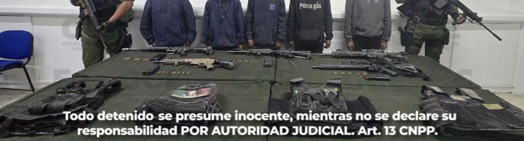 A dichas personas se les aseguraron cinco armas de fuego largas, cuatro tipo AR-15, y una multicalibre, ademas de cinco cargadores, 75 cartuchos útiles, 12 artefactos de varilla conocidos como poncha llantas y cuatro chalecos tácticos.