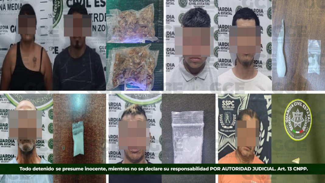 En el municipio de Villa de Pozos, elementos de la GCE detuvieron a Salvador “N” de 37 años de edad, luego de asegurarle una dosis de “cristal”, durante los operativos en la colonia Prados Segunda Sección; Raúl “N” de 19 años, fue ubicado en la colonia La Libertad, con una dosis de marihuana; la GCE detuvo a J. Guadalupe “N” de 61 años, en el municipio de Ciudad Valles, con una dosis de “cristal”; Hugo “N” de 31 años, fue ubicado en la colonia Francisco Villa, con dos dosis de marihuana; por su parte, en el municipio de Axtla de Terrazas, se detuvo a Adrián “N” de 25 años, con dos dosis de “cristal”; Armando “N” de 24 años; fue ubicado en el municipio de Ébano, con una dosis de marihuana.