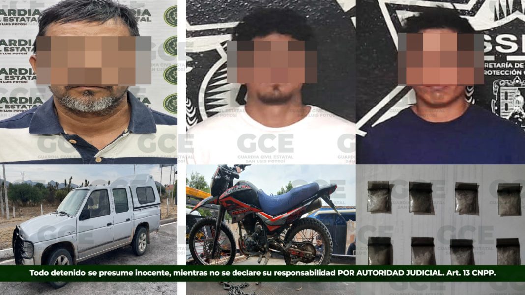 S.L.P.- Labores preventivas y de seguridad, implementadas por la Guardia Civil Estatal en todo el territorio potosino, derivó en la detención de tres personas por la tripulación de vehículos con reporte de robo, además del aseguramiento de varias dosis de enervantes.