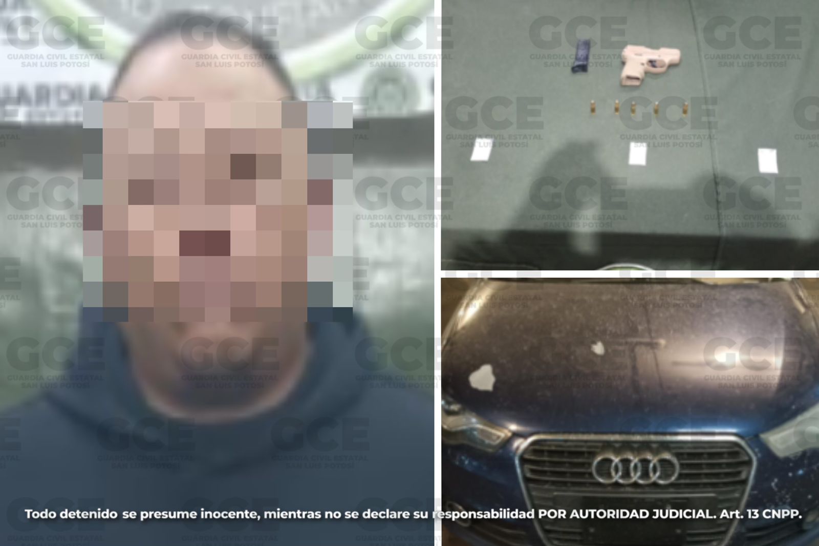 En Niño Artillero y Salvador Nava Martínez, Zona Universitaria en la capital potosina, se detuvo al tripulante de una unidad Audi Sedán, modelo 2013, en color azul con placas del Estado de Jalisco sin datos negativos.