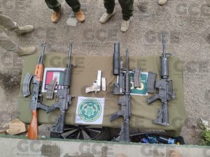 Durante la intervención, y conforme a los protocolos establecidos, se logró la detención de cinco personas, así como el aseguramiento de cuatro armas largas, un arma corta, cargadores, cartuchos y un vehículo sin reporte de robo. Posteriormente, en un segundo punto cercano, fueron asegurados otros dos individuos, a quienes se les localizaron objetos metálicos conocidos como artefactos ponchallantas.