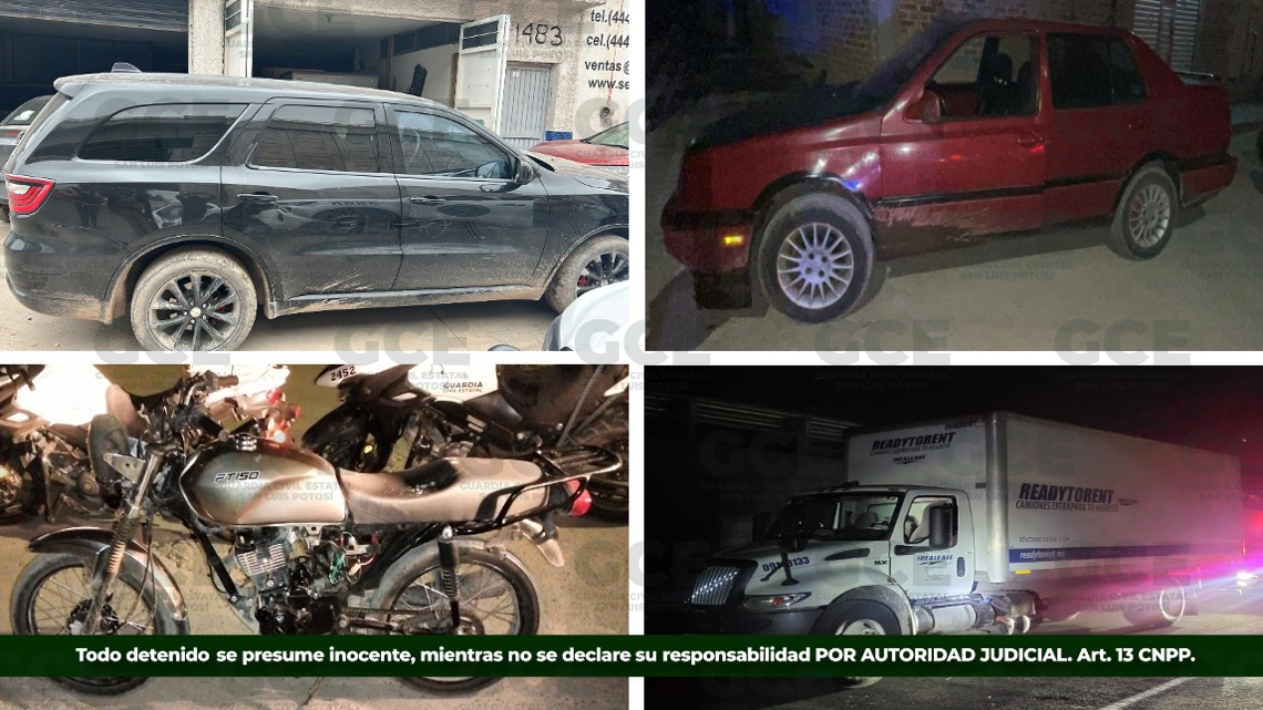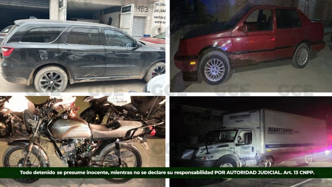Los dispositivos de la Guardia Civil Estatal en los 59 municipios, permitieron la recuperación de una camioneta Dodge Durango modelo 2014 color negro en la colonia La Angostura, de la capital potosina, mientras que en el municipio de Soledad de Graciano Sánchez, se recuperó un automóvil Volkswagen Jetta modelo 1996 color guinda y en la misma capital potosina, en la colonia División del Norte, agentes estatales recuperaron una motoicicleta Italika modelo 2023 color gris, con reporte de robo.