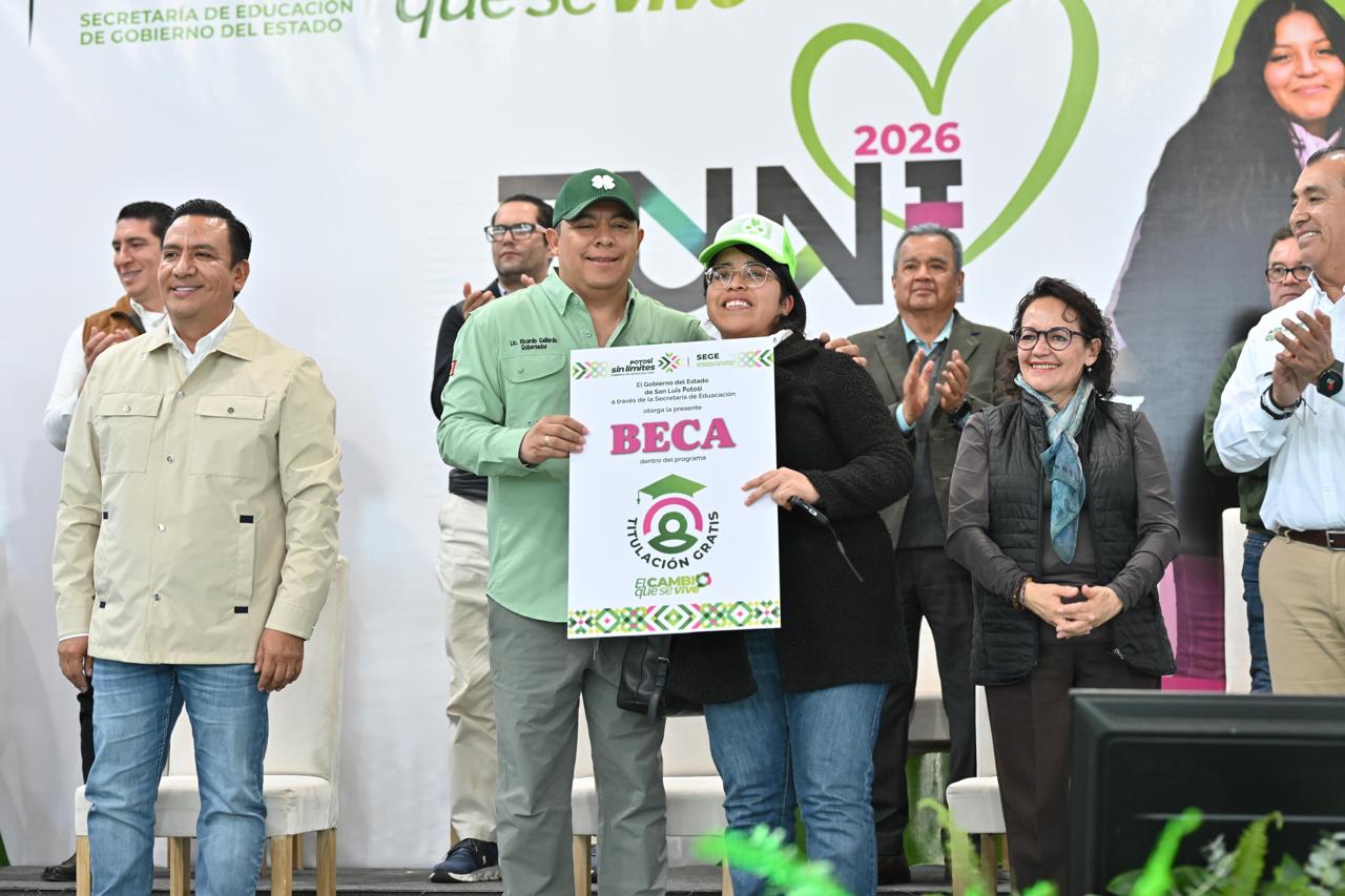 Con una proyección de asistencia de más de 10 mil alumnas y alumnos y la presencia de 80 instituciones educativas públicas y privadas, el Gobernador de San Luis Potosí Ricardo Gallardo Cardona, inauguró la Feria de Universidades Interactiva (FUNI) 2026 y entregó las primeras tres becas de titulación gratuita, que permitirá a miles de estudiantes concluir sus estudios y acceder con mayor facilidad a empleos mejor remunerados.