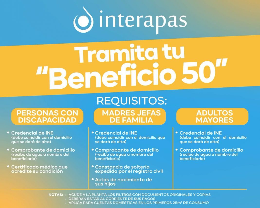Los adultos mayores deberán presentar, además de su INE, la credencial de INAPAM; las madres solteras deben adjuntar las actas de nacimiento de sus hijos junto con una constancia de soltería expedida por el Registro Civil; y las personas con discapacidad necesitan un certificado médico que acredite su condición. Todos los documentos deben presentarse en original y copia en las oficinas de INTERAPAS, ubicadas en Av. de Los Pintores No. 3, Colonia Los Filtros.