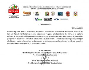 Con este pronunciamiento, la FEDESSP confirma que el movimiento por la defensa del sindicalismo libre en San Luis Potosí está más vivo que nunca. Y reitera: frente a la imposición, unidad y firmeza