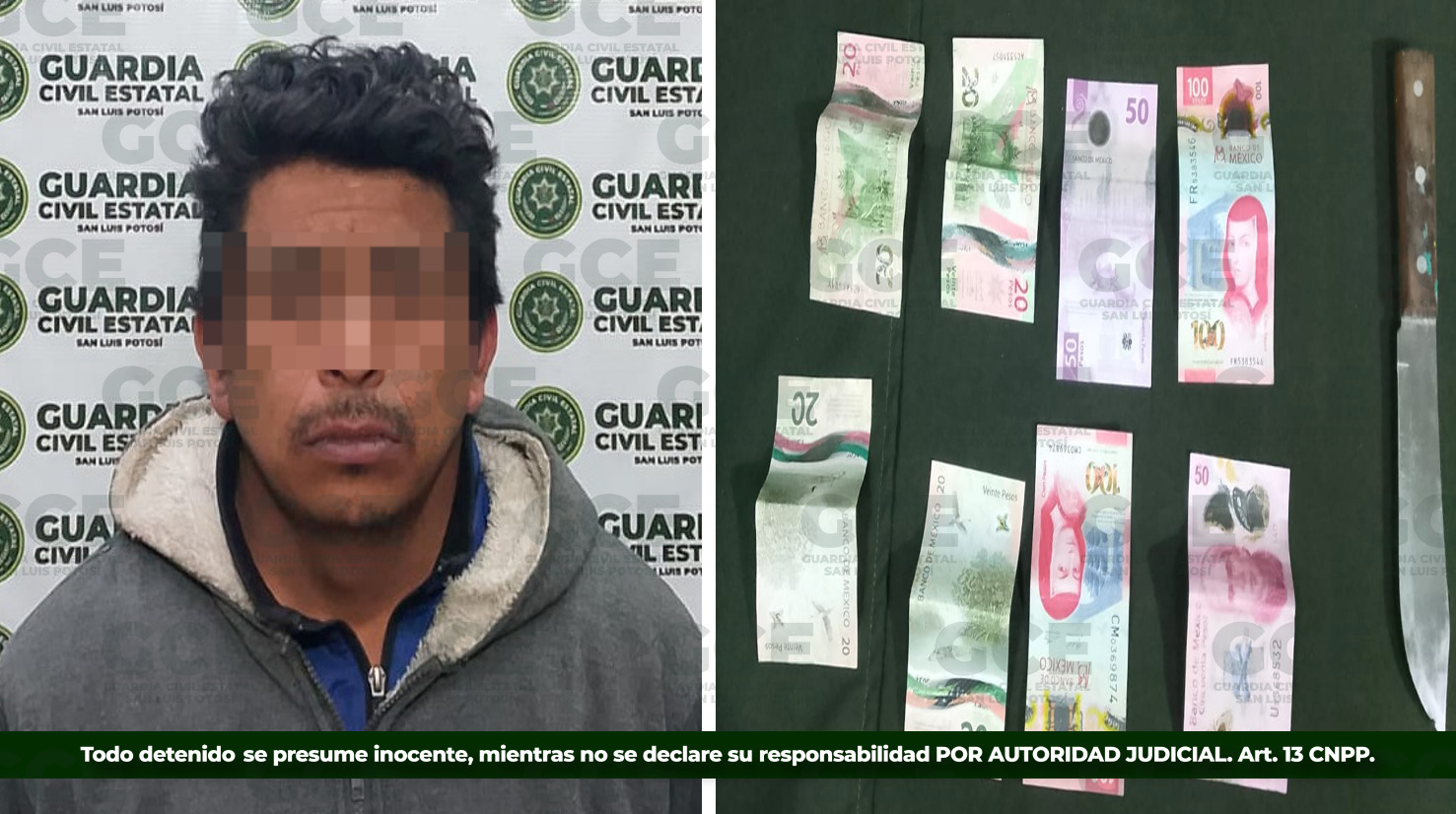 Agentes de la Guardia Civil Estatal detuvieron a Raúl “N” de 36 años, alias “Chano”, quien es señalado como posible perpretador de múltiples robos a comercio en la capital potosina, al cual se le aseguró un cuchillo y 380 pesos en efectivo.