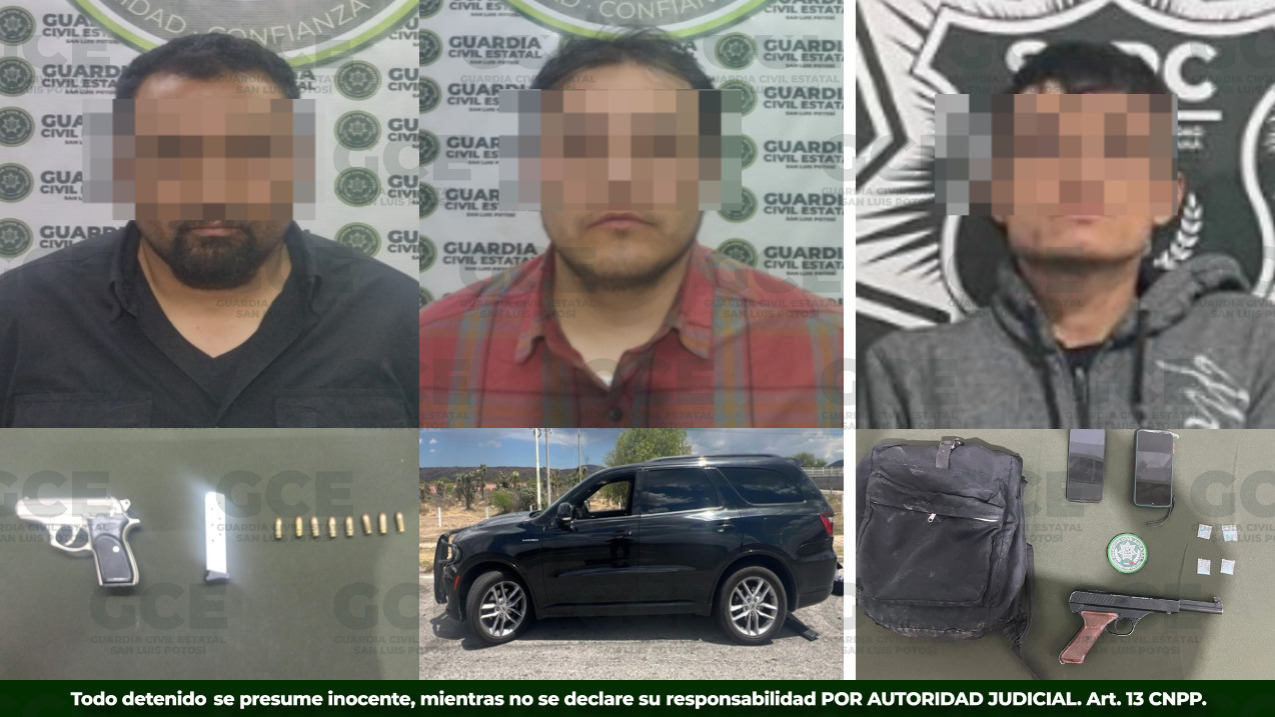 Como parte de las acciones permanentes de seguridad y vigilancia, la Guardia Civil Estatal (GCE) en coordinación con autoridades federales, detuvo a tres personas por su presunta responsabilidad en el delito de portación de arma de fuego, en hechos distintos registrados en los municipios de Villa de Reyes y Villa de Ramos.