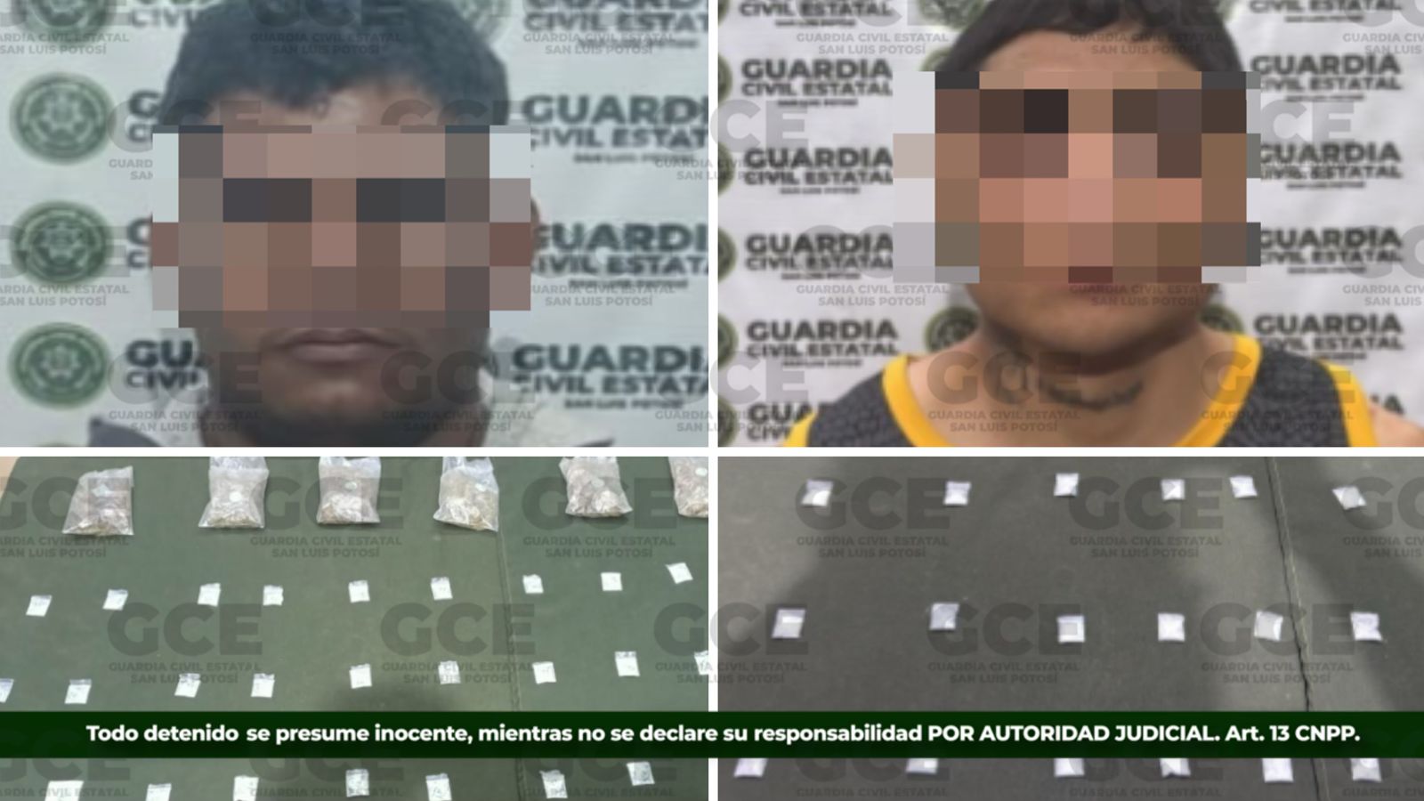 Para garantizar que las y los potosinos cuenten con mayores condiciones de seguridad y tranquilidad en las cuatro regiones, la Guardia Civil Estatal (GCE) detuvo a tres hombres y una mujer por su probable participación en delitos contra la salud, asegurándoles diversas dosis de estupefacientes.