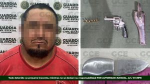 En una primera acción, derivado de un reporte al 9-1-1, elementos de la GCE desplegaron un operativo en la localidad La Estancia, en el municipio de Villa de Zaragoza, donde fue detenido Matías “N” de 48 años, a quien se le aseguró un arma de fuego tipo revólver, cinco cartuchos útiles, un casquillo percutido y un cuchillo.
