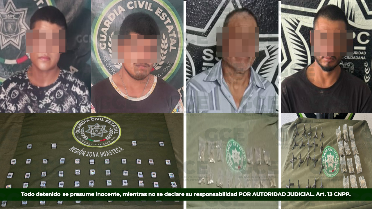 San Luis Potosí se consolida como uno de los estados más seguros del país y, derivado del éxito de la Estrategia Integral de Seguridad que brinda tranquilidad a las familias potosinas, en las últimas horas la Guardia Civil Estatal (GCE) detuvo a cuatro presuntos vendedores de estupefacientes en diferentes operativos, decomisándoles diversas dosis de droga.