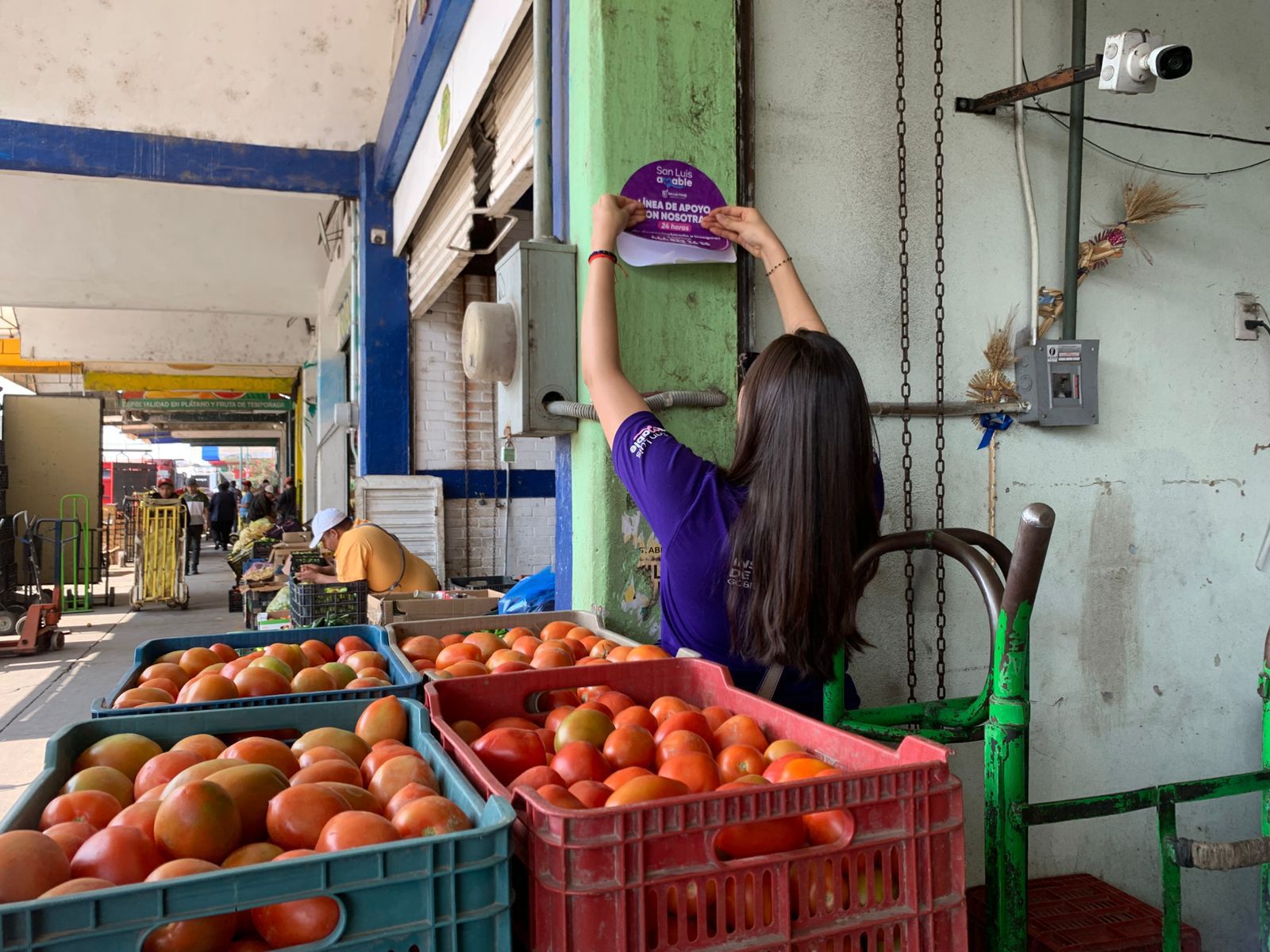 Con el objetivo de coadyuvar a la construcción de espacios seguros, solidarios y libres de todo tipo de violencia, la Instancia Municipal de las Mujeres realizó un recorrido por el Centro de Abastos, en el que se procedió a la colocación de stickers con la línea de apoyo “Con Nosotras” (444 8223635) que atiende casos de violencia contra las mujeres.
