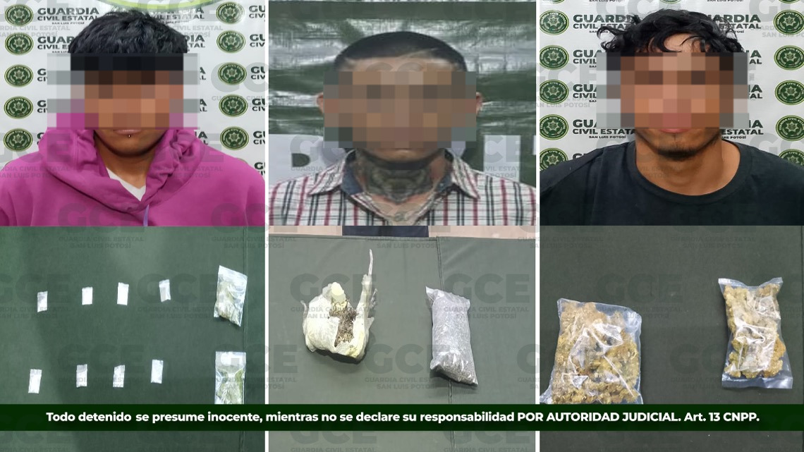 Uno de los hechos ocurrió en el municipio de Villa de Arriaga, ahí fue detenido Juan “N” de 32 años, a quien se le aseguraron 38 dosis de metanfetaminas, 12 de cocaína y tres de marihuana; mientras que, en el municipio de Salinas de Hidalgo, la GCE detuvo a Miguel “N” de 32 años, al asegurarle 10 dosis de “cristal”; por último, en el municipio de Villa de Reyes, las autoridades reportaron la detención de Paz “N” de 33 años, tras asegurarle 10 dosis de “cristal”.