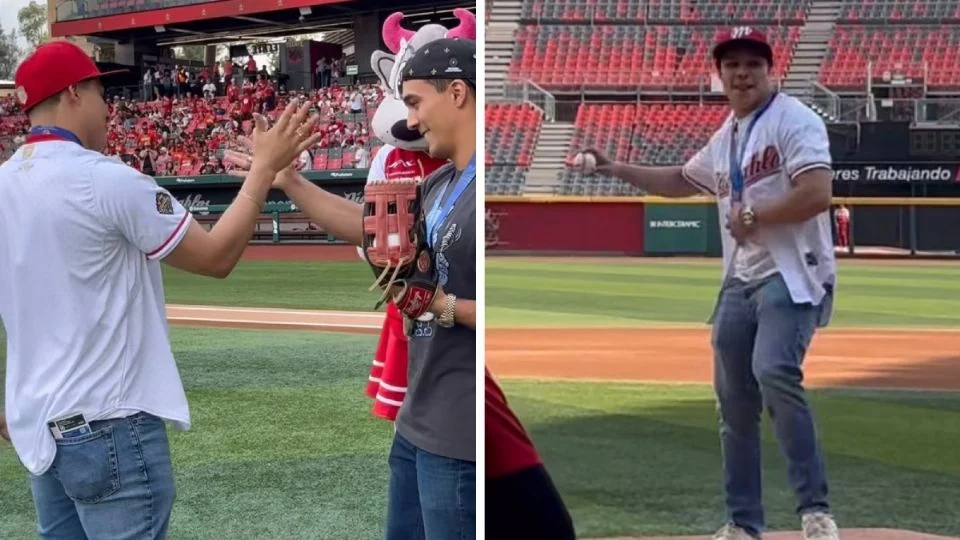 Osmar Olvera, campeón del mundo en clavados, lanzó este sábado la primera bola en el juego de los Diablos Rojos del México al abrir los playoffs 2025 de la Liga Mexicana de Beisbol (LMB).