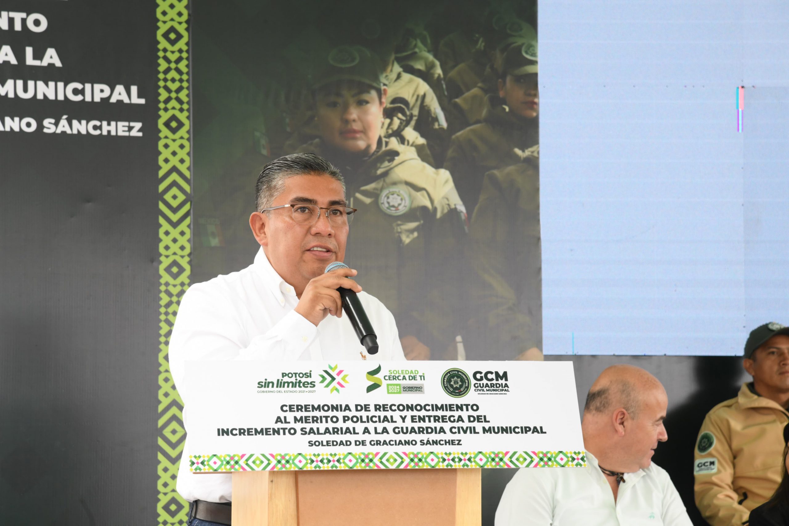 En el marco de la ceremonia que reconoció a oficiales de la Guardia Civil Municipal de Soledad de Graciano Sánchez, por mérito policial en sus funciones como servidores públicos, el Gobernador del Estado, Ricardo Gallardo Cardona, y el Alcalde Juan Manuel Navarro Muñiz, formalizaron el aumento salarial a la totalidad de agentes de la corporación de hasta un 40 por ciento, lo que genera condiciones y trato digno a quienes diariamente salen a arriesgar su vida para mantener la paz social.