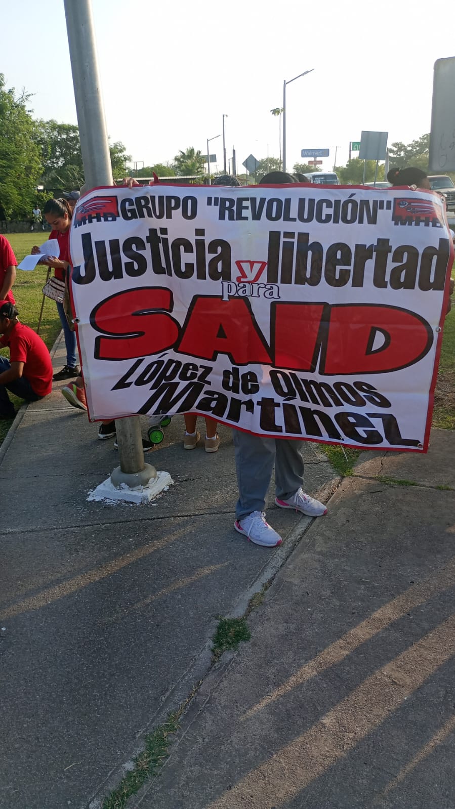 En la manifestación hubo pancarta pidiendo la interavención de la presidenta de México Claudia Sheinbaum para que López de Olmos quede en libertad.