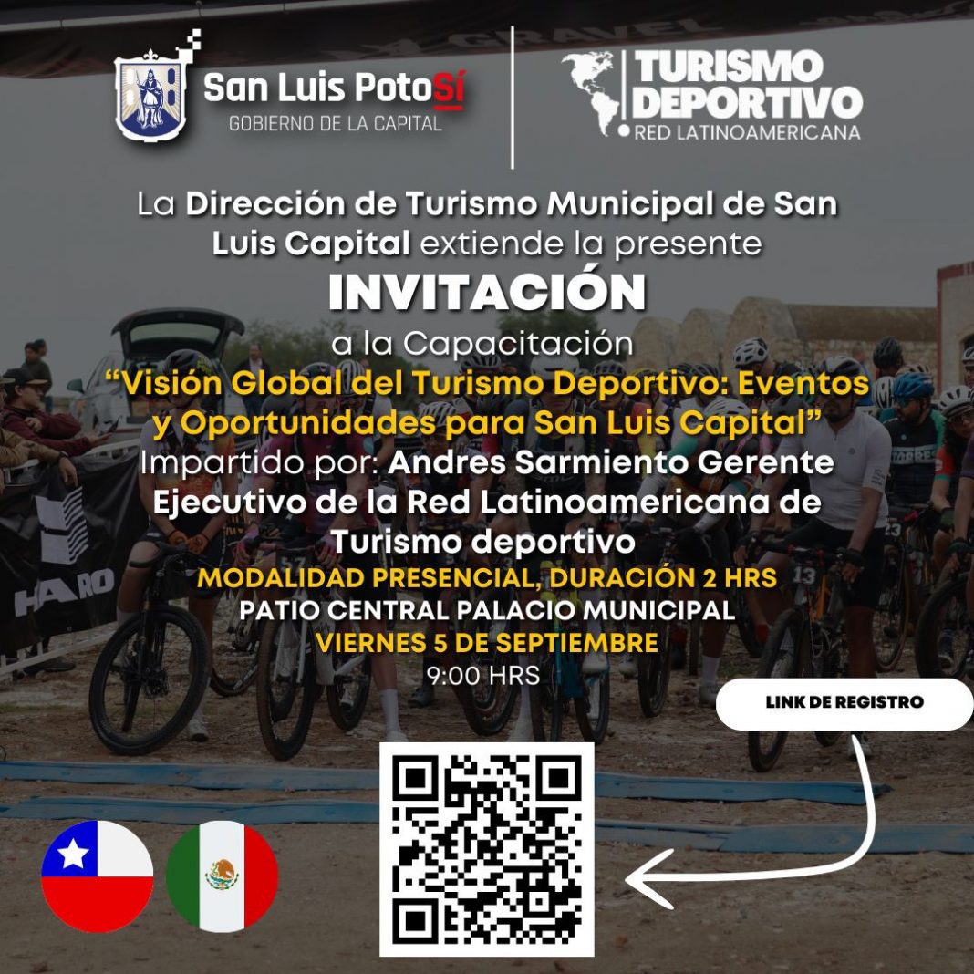 La Dirección de Turismo Municipal de San Luis Capital invita a la capacitación “Visión Global del Turismo Deportivo: Eventos y Oportunidades para San Luis Capital”, que será impartida por Andrés Sarmiento, Gerente Ejecutivo de la Red Latinoamericana de Turismo Deportivo.