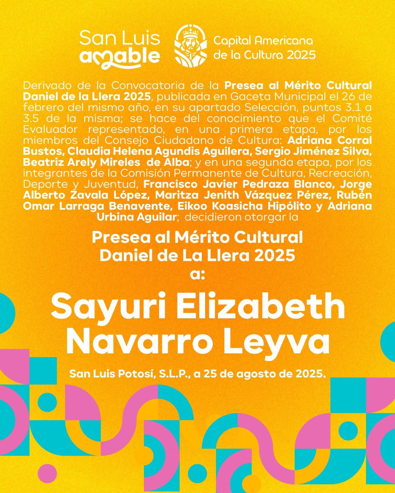 Los integrantes de la Comisión de Cultura y Deporte del Ayuntamiento de San Luis Potosí eligieron a la dramaturga potosina Sayuri Elizabeth Navarro Leyva como la acreedora de la Presea al Mérito Cultural “Daniel García Álvarez de la Llera”.