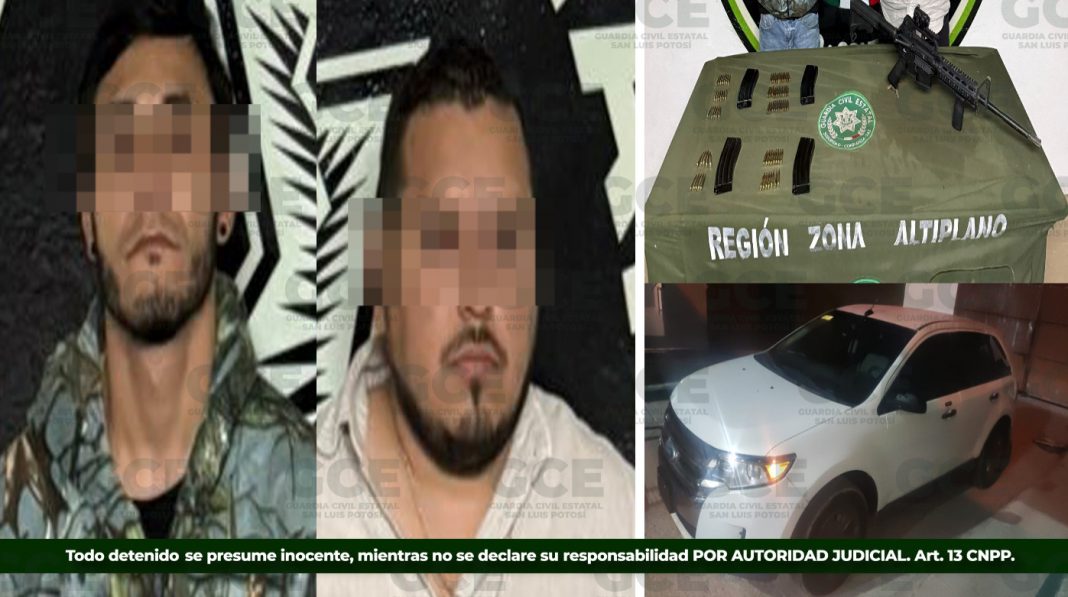 En las últimas 24 horas, durante el operativo Altiplano Seguro, la Guardia Civil Estatal realizó la detención de dos presuntos dedicados a desestabilizar la tranquilidad de la entidad, luego de asegurarle un arma de fuego tipo fusil de asalto, con cuatro cargadores y 70 cartuchos útiles, así como un vehículo Ford, tipo Edge, en el que se desplazaban.