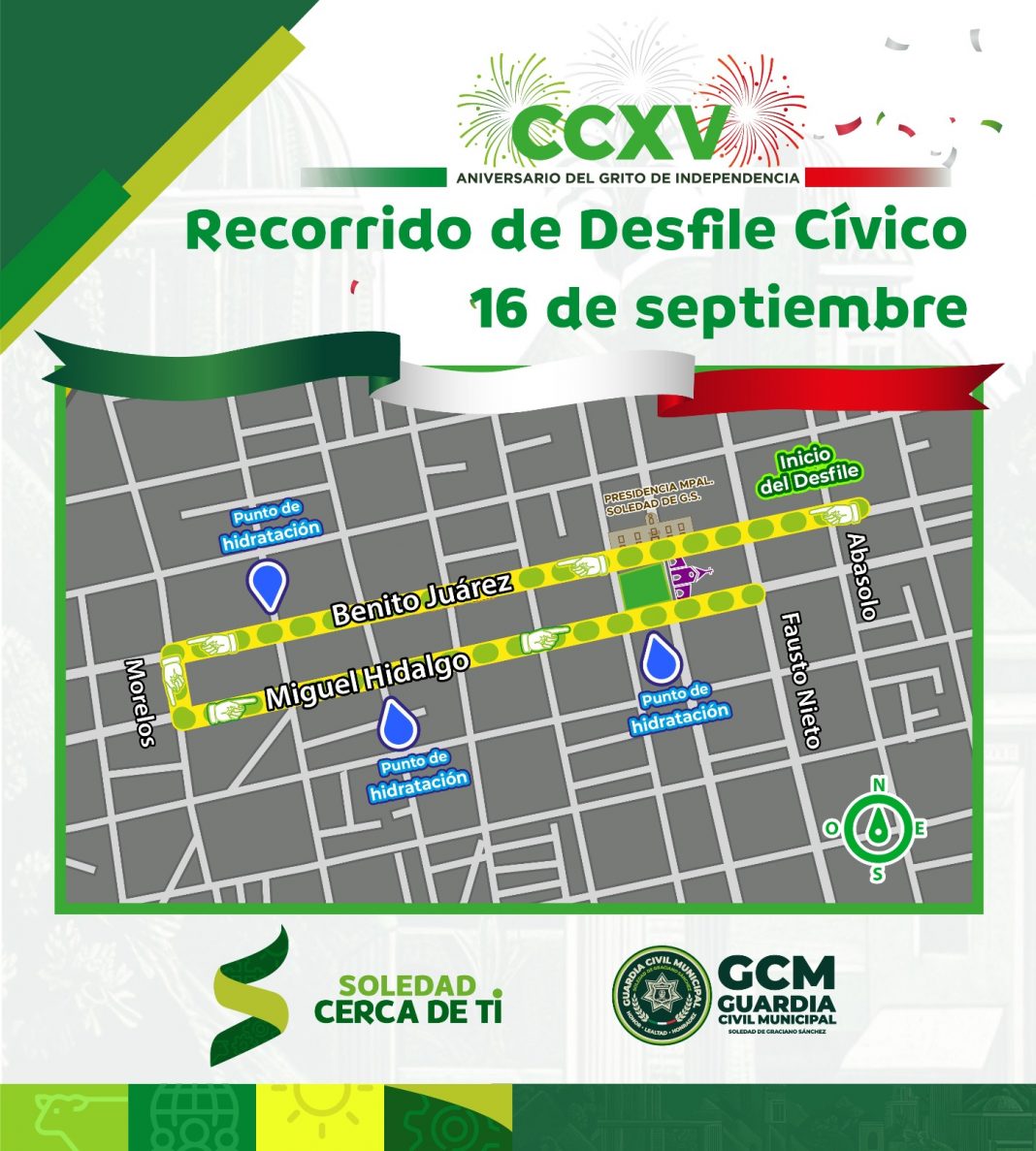 Para complementar e integrar las labores que se desplegarán con motivo de los festejos patrios del 15 y 16 de septiembre, la Dirección de Seguridad Vial y Movilidad de Soledad de Graciano Sánchez pondrá en marcha el “Plan General de Operaciones”, que brindará orientación, apoyo, auxilio e información a peatones, conductores y usuarios, además de agilizar el tránsito por los cierres de circulación que se instalarán en Cabecera Municipal.