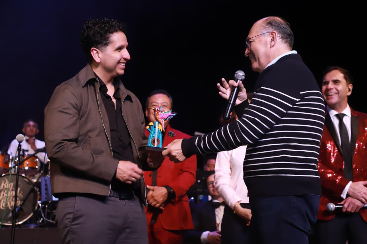 - El Alcalde Enrique Galindo encabezó el homenaje en el Teatro de la Paz, donde entregó un reconocimiento a Joan Gabriel, hijo del Divo de Juárez, en una noche en la que artistas como Rocío Banquells, María del Sol, Carlos Cuevas, Iván Caraza y Andresse dieron vida al legado de Juan Gabriel, junto a la Big Band Jazz de México.